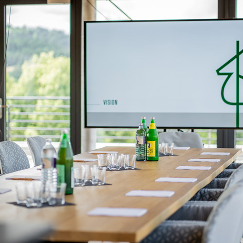 Im sogenannten „Wohnzimmer“ – dem höchsten Punkt des Boutique-Hotels – fühlt sich tagen nicht wie Business, sondern wie angenehmer Wachstum an. Der wundervolle Blick in die malerische, grüne Hügelwelt lässt Gedanken schneller ordnen, Ideen besser reifen und den Kopf zwischendurch entspannen.