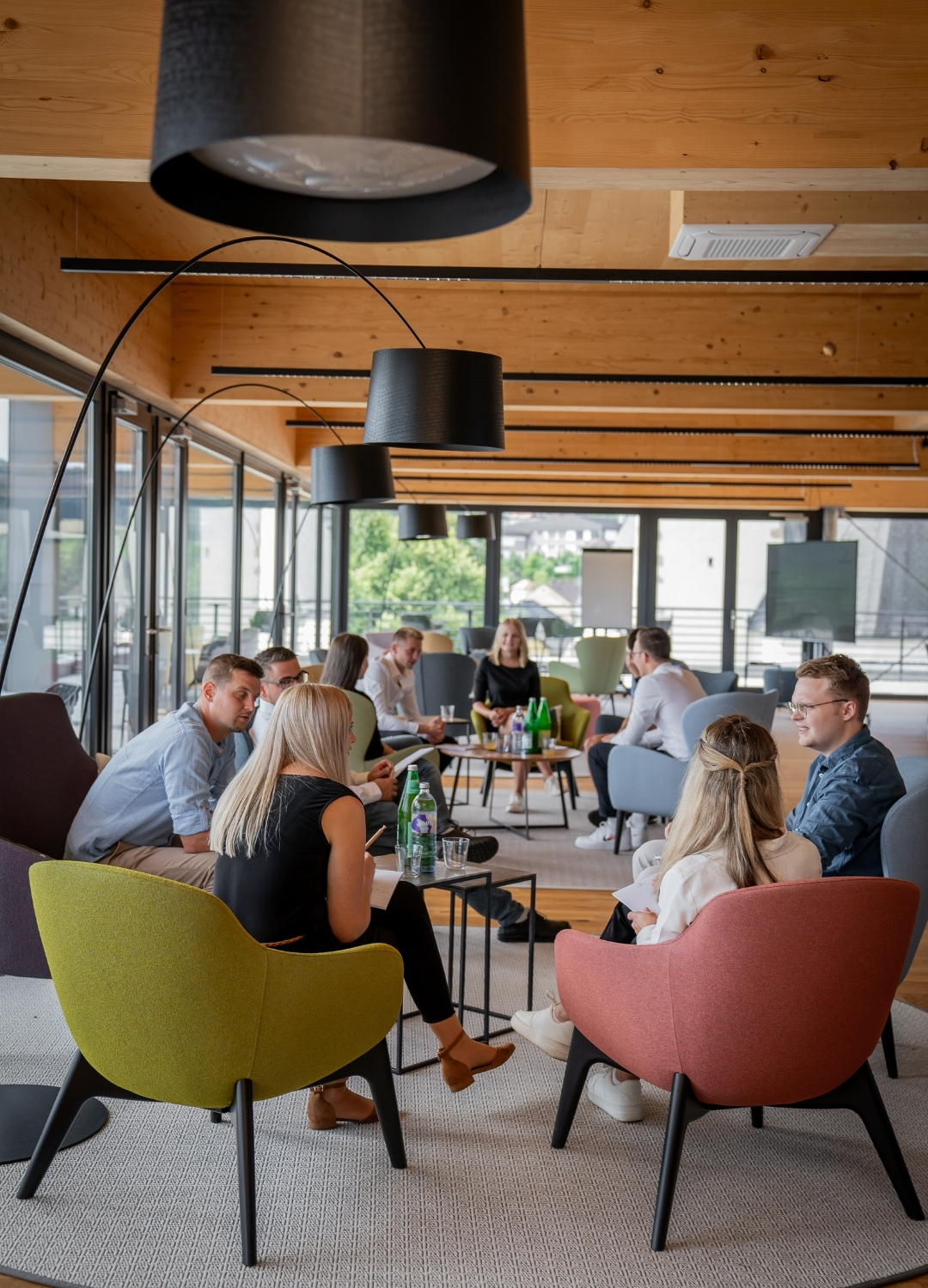 Unser Wohnzimmer fühl sich an wie Zuhause – ohne klassischer Seminarbestuhlung, dafür mit viel Platz und Tageslicht, neuester Technik, einer Küchenzeile, gemütlichen Sesseln und Hockern & einer großen Sonnenterrasse. Die ideale Eventlocation, um nachhaltig Konzepte, Projekte und Inspirationen reifen zu lassen.